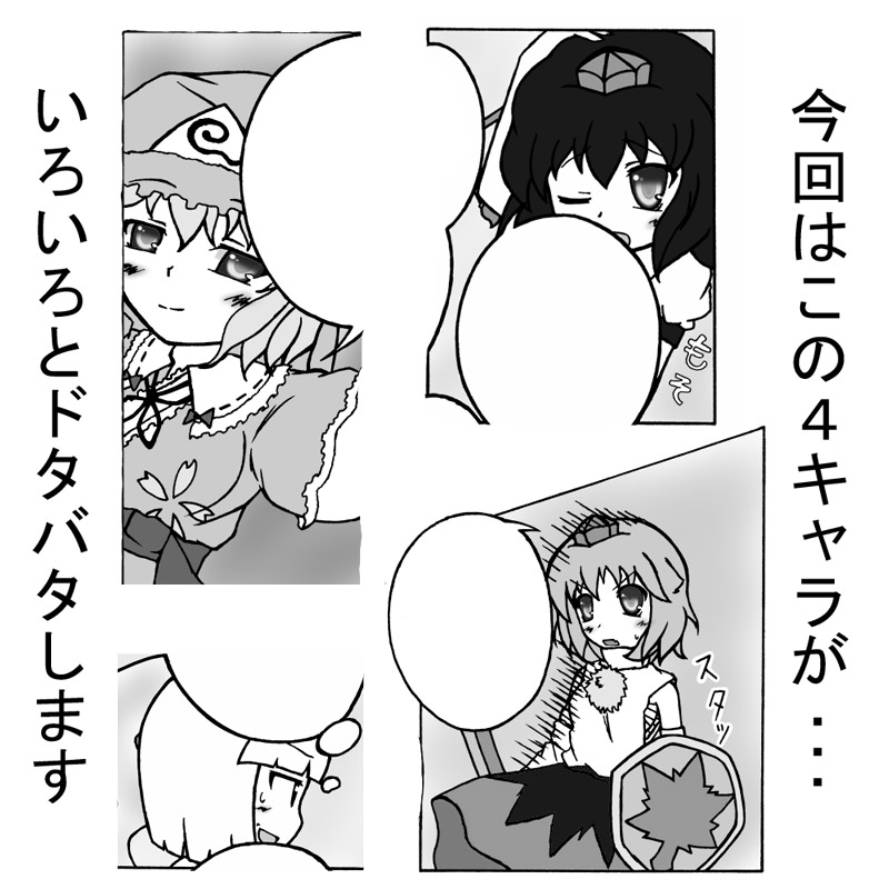 中央上の諏訪子と右下の妖夢と左下のパチェと右上のお燐が私です。